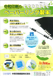 中綴じ、平綴じ、無線綴じ、折り加工、巻折り加工、穴あけ加工、型抜き(トムソン) 、ペーパーリング製本、スパイラルリング、ダブルリング